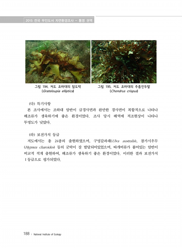 2015 전국 무인도서 자연환경조사 통영 권역 188 ? National Institute of Ecology 그림 194. 저도 조하대의 참도박 Grateloupia elliptica 그림 195. 저도 조하대의 주름진두발 Chondrus crispus 다 특기사항 본 조사에서는 조하대 암반이 급경사면과 완만한 경사면이 복합적으로 나타나 해조류가 생육하기에 좋은 환경이었다. 조사 당시 해역에 적조현상이 나타나 투명도가 낮았다. 라 보전가치 등급 저도에서는 총 24종의 출현하였으며, 구멍갈파래 Ulva australis , 참가시우무 Hypnea charoides 등의 군락이 잘 발달되어있었으며, 따개비류가 붙어있는 암반이 비교적 적게 출현하여, 해조류가 생육하기 좋은 환경이었다. 이러한 결과 보전가치 Ⅰ등...