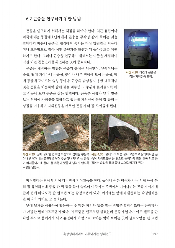 육상생태계에서 이루어지는 생태연구 197 6.2 곤충을 연구하기 위한 방법 곤충을 연구하기 위해서는 채집을 하여야 한다. 최근 유럽이나 미국에서는 동물애호단체에서 곤충을 무작정 잡아 죽이는 것을 반대하기 때문에 곤충을 채집하여 죽이는 대신 망원경을 이용하 거나 포충망으로 잡아 어떤 종인가를 확인한 뒤 놓아주도록 제안 하기도 한다. 그러나 곤충을 연구하기 위해서는 이들을 채집하여 직접 어떤 곤충인가를 확인하는 것이 중요하다. 곤충을 채집하는 방법은 곤충의 습성을 이용한다. 날아다니는 습성, 땅에 기어다니는 습성, 꽃이나 나무 진액에 모이는 습성, 밤 에 등불에 모여드는 습성 등이다. 곤충의 습성을 이용한 대표적인 것은 등불을 이용하여 밤에 불을 켜두면 그 주위에 몰려들도록 하 고 이곳에 모인 곤충을 잡는 방법...