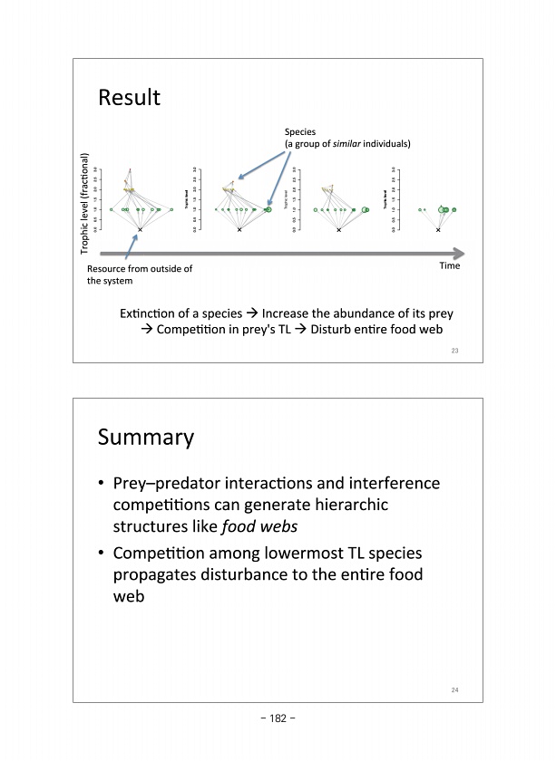 Summary ?? Prey?predator interac1ons and interference compe11ons can generate hierarchic structures like food webs ?? Compe11on among lowermost TL species propagates disturbance to the en1re food web 24 Result 0.0 0.5 1.0 1.5 2.0 2.5 3.0 Trophic level 0.0 0.5 1.0 1.5 2.0 2.5 3.0 Trophic level 0.0 0.5 1.0 1.5 2.0 2.5 3.0 Trophic level 0.0 0.5 1.0 1.5 2.0 2.5 3.0 Trophic level Time Trophic level fra...