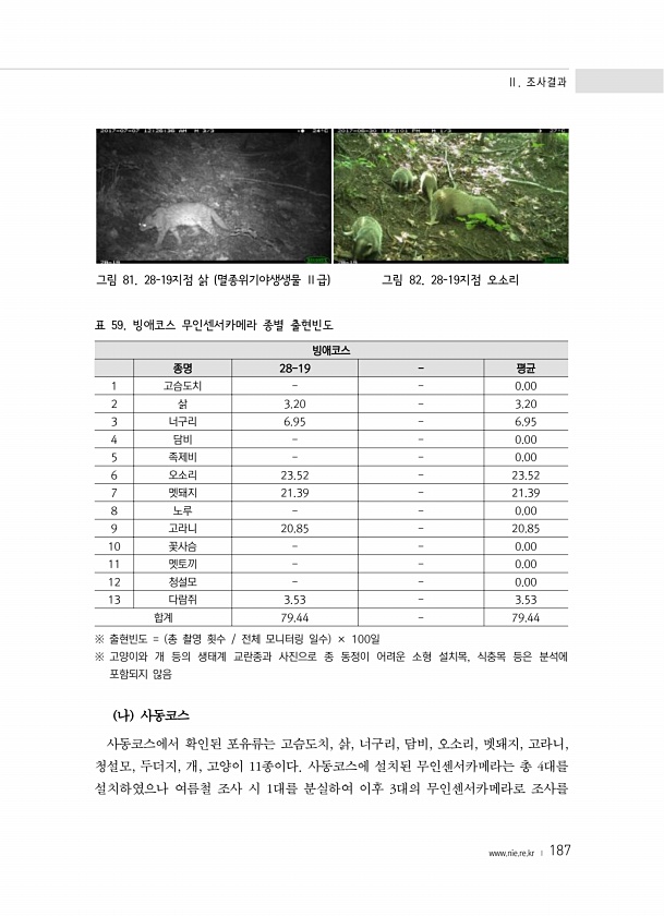 Ⅱ. 조사결과 www.nie.re.kr ? 187 그림 81. 28-19지점 삵 멸종위기야생생물 Ⅱ급 그림 82. 28-19지점 오소리 빙애코스 종명 28-19 평균 1 고슴도치 0.00 2 삵 3.20 3.20 3 너구리 6.95 6.95 4 담비 0.00 5 족제비 0.00 6 오소리 23.52 23.52 7 멧돼지 21.39 21.39 8 노루 0.00 9 고라니 20.85 20.85 10 꽃사슴 0.00 11 멧토끼 0.00 12 청설모 0.00 13 다람쥐 3.53 3.53 합계 79.44 79.44 표 59. 빙애코스 무인센서카메라 종별 출현빈도 ※ 출현빈도 = 총 촬영 횟수 전체 모니터링 일수 × 100일 ※ 고양이와 개 등의 생태계 교란종과 사진으로 종 동정이 어려운 소형 설치목, 식충목 등은...