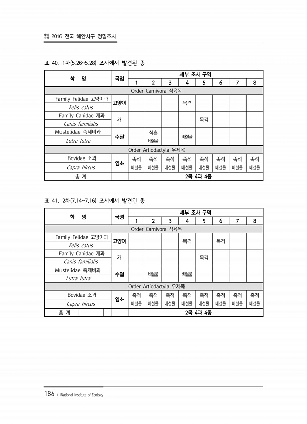 2016 전국 해안사구 정밀조사 186 ? National Institute of Ecology 학 명 국명 세부 조사 구역 1 2 3 4 5 6 7 8 Order Carnivora 식육목 Family Felidae 고양이과 고양이 목격 Felis catus Family Canidae 개과 개 목격 Canis familialis Mustelidae 족제비과 수달 식흔 배설물 배설물 Lutra lutra Order Artiodactyla 우제목 Bovidae 소과 염소 족적 배설물 족적 배설물 족적 배설물 족적 배설물 족적 배설물 족적 배설물 족적 배설물 족적 Capra hircus 배설물 총 계 2목 4과 4종 표 40. 1차 5.265.28 조사에서 발견된 종 학 명 국명 세부 조사 구역 1 2 3 4 5...