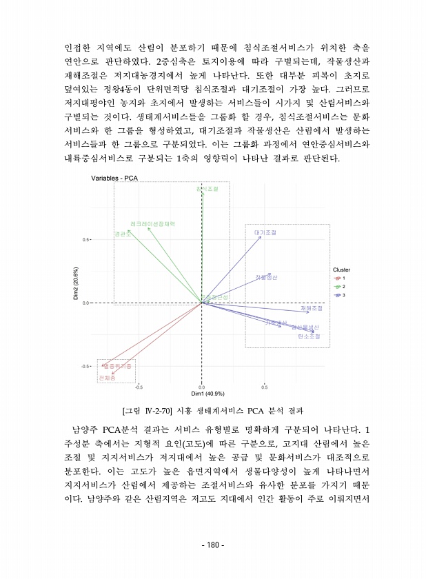 인접한 지역에도 산림이 분포하기 때문에 침식조절서비스가 위치한 축을 연안으로 판단하였다. 2중심축은 토지이용에 따라 구별되는데, 작물생산과 재해조절은 저지대농경지에서 높게 나타난다. 또한 대부분 피복이 초지로 덮여있는 정왕4동이 단위면적당 침식조절과 대기조절이 가장 높다. 그러므로 저지대평야인 농지와 초지에서 발생하는 서비스들이 시가지 및 산림서비스와 구별되는 것이다. 생태계서비스들을 그룹화 할 경우, 침식조절서비스는 문화 서비스와 한 그룹을 형성하였고, 대기조절과 작물생산은 산림에서 발생하는 서비스들과 한 그룹으로 구분되었다. 이는 그룹화 과정에서 연안중심서비스와 내륙중심서비스로 구분되는 1축의 영향력이 나타난 결과로 판단된다. [그림 Ⅳ-2-70] 시흥 생태계서비스 PCA 분석 결과 남양주 PCA분석 결...