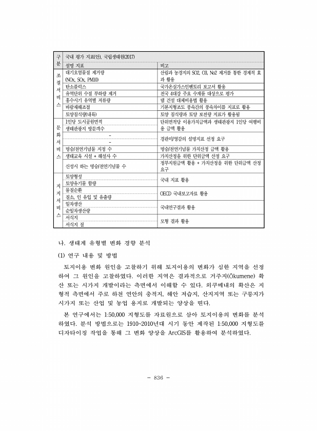 836 구 분 국내 평가 지표 안 , 국립생태원 2017 설명 지표 비고 조 절 서 비 스 대기오염물질 제거량 NOx, SOx, PM10 산림과 농경지의 SO2, O3, No2 제거를 통한 경제적 효 과 활용 탄소플럭스 국가온실가스인벤토리 보고서 활용 유역단위 수질 부하량 제거 전국 4대강 주요 수계를 대상으로 평가 홍수시기 유역별 저류량 댐 건설 대체비용법 활용 바람재해조절 기본지형조도 풍속간의 풍속차이를 지표로 활용 토양침식량 내륙 토양 침식량과 토양 보전량 지표가 활용됨 문 화 서 비 스 1인당 도시공원면적 단위면적당 이용가치금액과 생태관광지 1인당 여행비 생태관광지 방문객수 용 금액 활용 경관미/영감의 설명지표 선정 요구 명승/천연기념물 지정 수 명승/천연기념물 가치산정 금액 활용 생태교육 시설 + ...