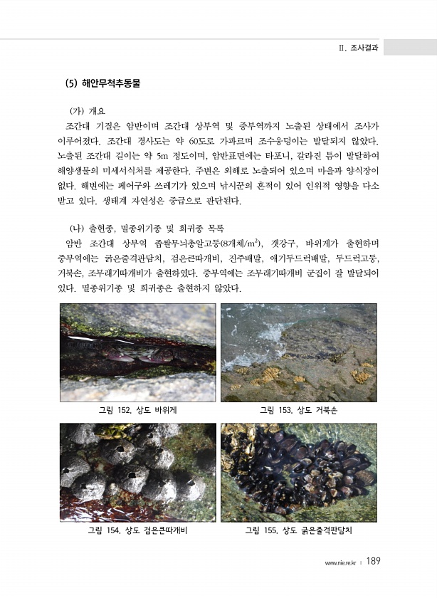 Ⅱ. 조사결과 www.nie.re.kr ? 189 5 해안무척추동물 가 개요 조간대 기질은 암반이며 조간대 상부역 및 중부역까지 노출된 상태에서 조사가 이루어졌다. 조간대 경사도는 약 60도로 가파르며 조수웅덩이는 발달되지 않았다. 노출된 조간대 길이는 약 5m 정도이며, 암반표면에는 타포니, 갈라진 틈이 발달하여 해양생물의 미세서식처를 제공한다. 주변은 외해로 노출되어 있으며 마을과 양식장이 없다. 해변에는 페어구와 쓰레기가 있으며 낚시꾼의 흔적이 있어 인위적 영향을 다소 받고 있다. 생태계 자연성은 중급으로 판단된다. 나 출현종, 멸종위기종 및 희귀종 목록 암반 조간대 상부역 좁쌀무늬총알고둥 8개체/m2 , 갯강구, 바위게가 출현하며 중부역에는 굵은줄격판담치, 검은큰따개비, 진주배말, 애기두드럭배말, 두...