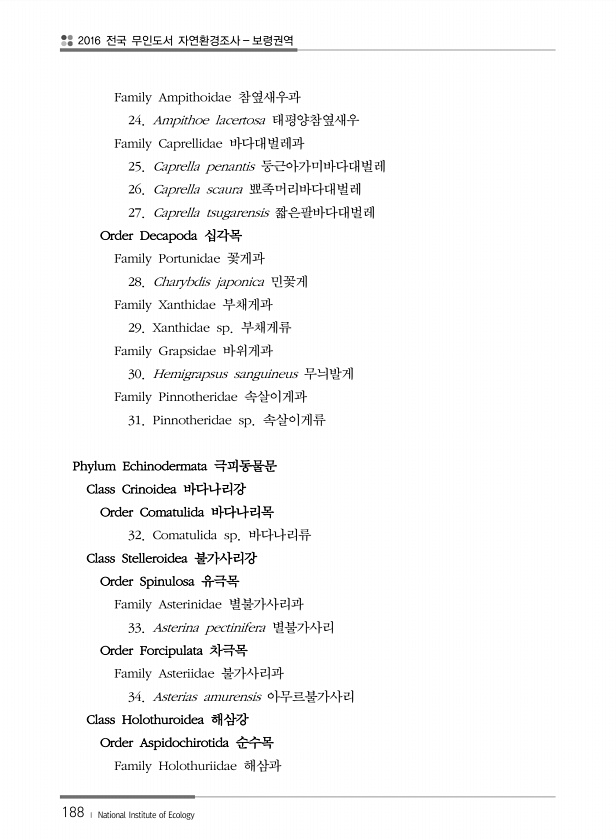 2016 전국 무인도서 자연환경조사 보령권역 188 ? National Institute of Ecology Family Ampithoidae 참옆새우과 24. Ampithoe lacertosa 태평양참옆새우 Family Caprellidae 바다대벌레과 25. Caprella penantis 둥근아가미바다대벌레 26. Caprella scaura 뾰족머리바다대벌레 27. Caprella tsugarensis 짧은팔바다대벌레 Order Decapoda 십각목 Family Portunidae 꽃게과 28. Charybdis japonica 민꽃게 Family Xanthidae 부채게과 29. Xanthidae sp. 부채게류 Family Grapsidae 바위게과 30. Hemigrapsus sanguineu...