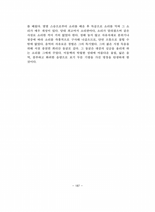187 를 배웠다 몇몇 스승으로부터 소리를 배운 후 독공으로 소리를 익혀 그 소 리가 매우 개성이 있다 당대 최고여서 소리판마다 소리가 달라졌으며 같은 사설로 소리한 적이 거의 없었다 한다 정해 놓지 않고 자유자재로 분위기나 청중에 따라 소리를 즉흥적으로 구사해 나갔으므로 단연 으뜸으로 꼽힐 수 밖에 없었다 음역의 자유로운 창법은 그의 특기였다 그의 젊은 시절 득음을 위해 서천 종천면 희리산 동굴로 갔다 그 동굴은 대중의 심금을 울리게 하 는 소리를 그에게 주었다 이동백의 탁월한 성대에 아름다운 울림 넓은 음 역 풍부하고 화려한 음량으로 보기 두문 기량을 가진 명창을 탄생하게 한것이다
