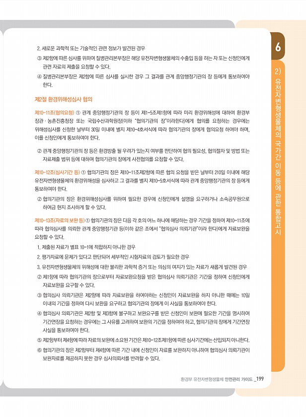 환경부 유전자변형생물체 안전관리 가이드 _199 6 유전자변형생물체의 국가간 이동 등에 관한 통합고시 2 2. 새로운 과학적 또는 기술적인 관련 정보가 발견된 경우 ③ 제2항에 따른 심사를 위하여 질병관리본부장은 해당 유전자변형생물체의 수출입 등을 하는 자 또는 신청인에게 관련 자료의 제출을 요청할 수 있다. ④ 질병관리본부장은 제2항에 따른 심사를 실시한 경우 그 결과를 관계 중앙행정기관의 장 등에게 통보하여야 한다. 제2절 환경위해성심사 협의 제10-11조 협의요청 ① 관계 중앙행정기관의 장 등이 제1-5조제1항에 따라 미리 환경위해성에 대하여 환경부 장관·농촌진흥청장 또는 국립수산과학원장 이하 “협의기관의 장”이라한다 에게 협의를 요청하는 경우에는 위해성심사를 신청한 날부터 30일 이내에 별지 제10-...