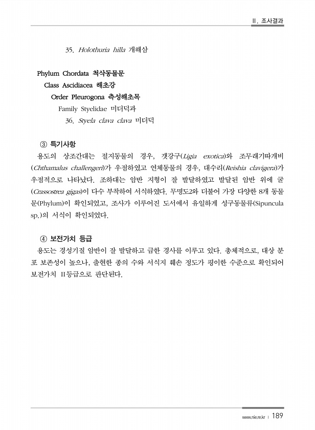 Ⅱ. 조사결과 www.nie.re.kr ? 189 35. Holothuria hilla 개해삼 Phylum Chordata 척삭동물문 Class Ascidiacea 해초강 Order Pleurogona 측성해초목 Family Styelidae 미더덕과 36. Styela clava clava 미더덕 ③ 특기사항 용도의 상조간대는 절지동물의 경우, 갯강구 Ligia exotica 와 조무래기따개비 Chthamalus challengeri 가 우점하였고 연체동물의 경우, 대수리 Reishia clavigera 가 우점적으로 나타났다. 조하대는 암반 지형이 잘 발달하였고 발달된 암반 위에 굴 Crassostrea gigas 이 다수 부착하여 서식하였다. 무명도2와 더불어 가장 다양한 8개 동물 문 Phylum 이...