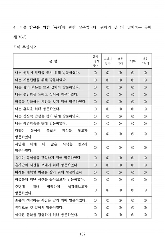 182 4. 이곳 방문을 위한 ‘동기’에 관한 질문입니다. 귀하의 생각과 일치하는 곳에 체크 √ 하여 주십시오. 문 항 전혀 그렇지 않다 그렇지 않다 보통 이다 그렇다 매우 그렇다 나는 생활에 활력을 얻기 위해 방문하였다. ① ② ③ ④ ⑤ 나는 기분전환을 위해 방문하였다. ① ② ③ ④ ⑤ 나는 삶의 여유를 찾고 싶어서 방문하였다. ① ② ③ ④ ⑤ 나는 평안함을 느끼고 싶어서 방문하였다. ① ② ③ ④ ⑤ 마음을 정화하는 시간을 갖기 위해 방문하였다. ① ② ③ ④ ⑤ 나는 휴식을 위해 방문하였다. ① ② ③ ④ ⑤ 나는 정신적 안정을 찾기 위해 방문하였다. ① ② ③ ④ ⑤ 나는 자연학습을 위해 방문하였다. ① ② ③ ④ ⑤ 다양한 분야에 폭넓은 지식을 쌓고자 방문하였다. ① ② ③ ④ ⑤ 자연에 대해...