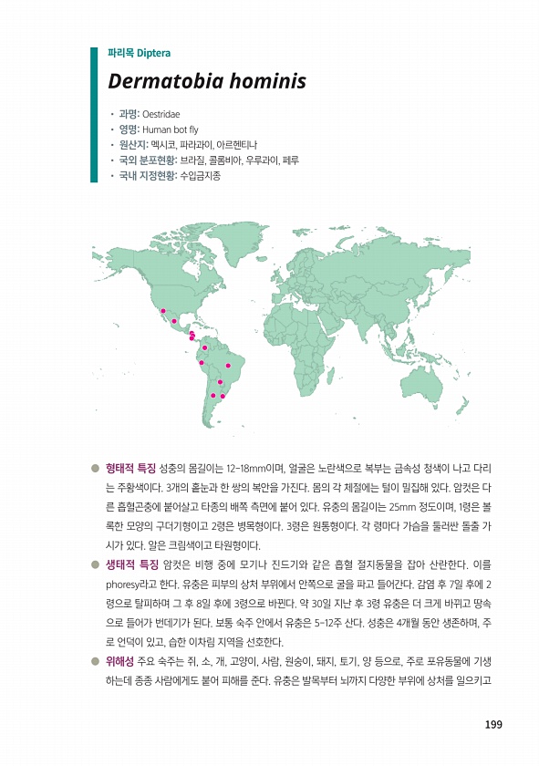 199 ● 형태적 특징 성충의 몸길이는 12-18mm이며, 얼굴은 노란색으로 복부는 금속성 청색이 나고 다리 는 주황색이다. 3개의 홑눈과 한 쌍의 복안을 가진다. 몸의 각 체절에는 털이 밀집해 있다. 암컷은 다 른 흡혈곤충에 붙어살고 타종의 배쪽 측면에 붙어 있다. 유충의 몸길이는 25mm 정도이며, 1령은 볼 록한 모양의 구더기형이고 2령은 병목형이다. 3령은 원통형이다. 각 령마다 가슴을 둘러싼 돌출 가 시가 있다. 알은 크림색이고 타원형이다. ● 생태적 특징 암컷은 비행 중에 모기나 진드기와 같은 흡혈 절지동물을 잡아 산란한다. 이를 phoresy라고 한다. 유충은 피부의 상처 부위에서 안쪽으로 굴을 파고 들어간다. 감염 후 7일 후에 2 령으로 탈피하며 그 후 8일 후에 3령으로 바뀐다. 약 30일...