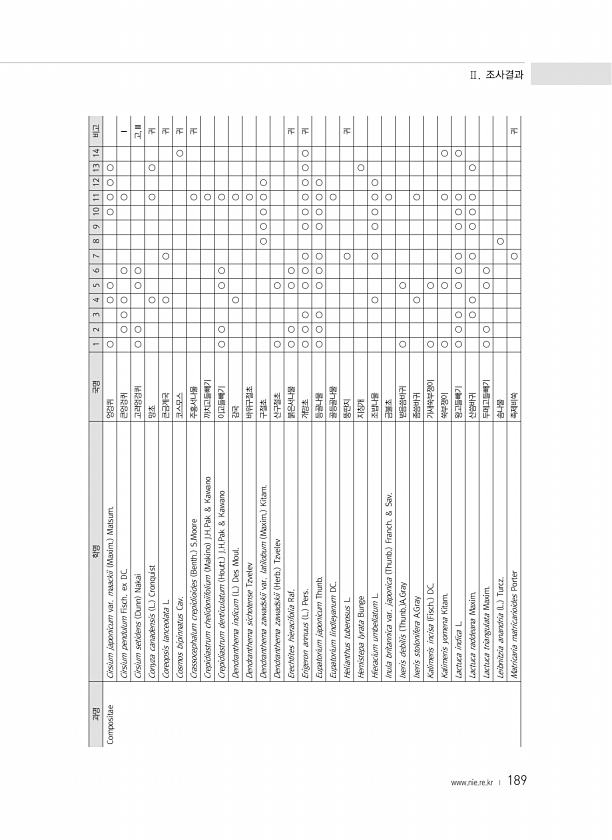 189 과명 학명 국명 1 2 3 4 5 6 7 8 9 10 11 12 13 14 비고 Compositae Cirsium japonicum var. maackii Maxim. Matsum. 엉겅퀴 ○ ○ ○ ○ ○ ○ ○ Cirsium pendulum Fisch. ex DC. 큰엉겅퀴 ○ ○ ○ ○ ○ Ⅰ Cirsium setidens Dunn Nakai 고려엉겅퀴 ○ ○ ○ ○ 고,Ⅲ Conyza canadensis L. Cronquist 망초 ○ ○ ○ 귀 Coreopsis lanceolata L. 큰금계국 ○ ○ 귀 Cosmos bipinnatus Cav. 코스모스 ○ 귀 Crassocephalum crepidioides Benth. S.Moore 주홍서나물 ○ 귀 Crepidiastrum chelid...