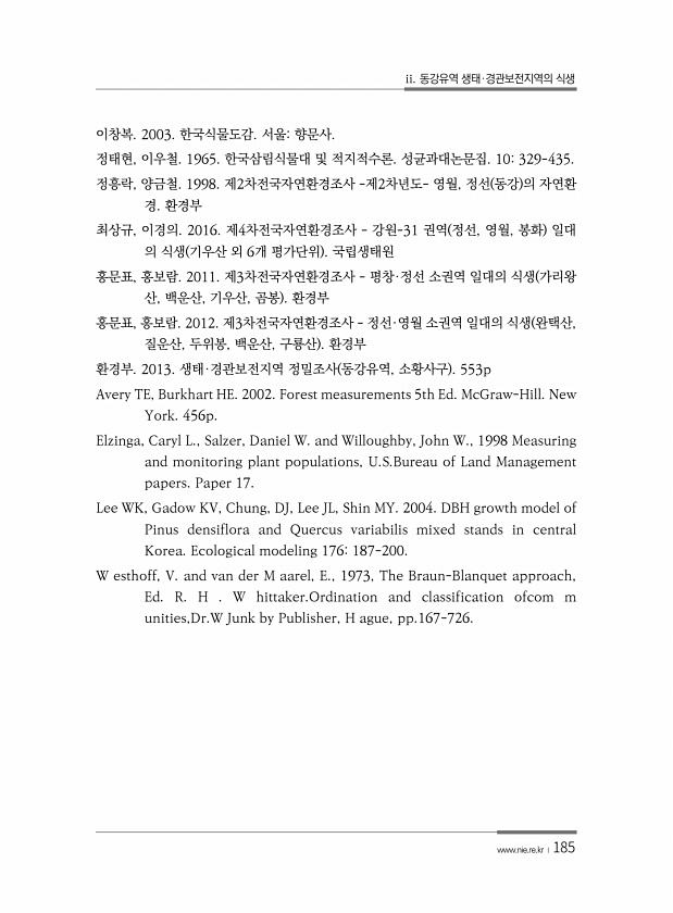 ii. 동강유역 생태·경관보전지역의 식생 www.nie.re.kr ?185 이창복. 2003. 한국식물도감. 서울향문사. 정태현, 이우철. 1965. 한국삼림식물대 및 적지적수론. 성균과대논문집. 10329-435. 정흥락, 양금철. 1998. 제2차전국자연환경조사 -제2차년도- 영월, 정선 동강 의 자연환 경. 환경부 최상규, 이경의. 2016. 제4차전국자연환경조사 강원-31 권역 정선, 영월, 봉화 일대 의 식생 기우산 외 6개 평가단위 국립생태원 홍문표, 홍보람. 2011. 제3차전국자연환경조사 평창·정선 소권역 일대의 식생 가리왕 산, 백운산, 기우산, 곰봉 환경부 홍문표, 홍보람. 2012. 제3차전국자연환경조사 정선·영월 소권역 일대의 식생 완택산, 질운산, 두위봉, 백운산, 구룡산 환경부 환경...