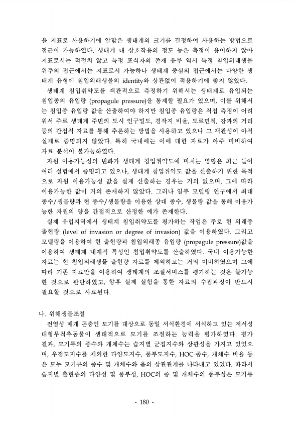 을 지표로 사용하기에 알맞은 생태계의 크기를 결정하여 사용하는 방법으로 접근이 가능하였다 생태계 내 상호작용의 정도 등은 측정이 용이하지 않아 지표로서는 적절치 않고 특정 포식자의 존재 유무 역시 특정 침입외래생물 위주의 접근에서는 지표로서 가능하나 생태계 중심의 접근에서는 다양한 생 태계 유형에 침입외래생물의 와 상관없이 적용하기에 좋지 않았다 생태계 침입취약도를 객관적으로 측정하기 위해서는 생태계로 유입되는 침입종의 유입량 을 통제할 필요가 있으며 이를 위해서 는 침입종 유입량 값을 산출하여야 하지만 침입종 유입량은 직접 측정이 어려 워서 주로 생태계 주변의 도시 인구밀도 경작지 비율 도로면적 강과의 거리 등의 간접적 자료를 통해 추론하는 방법을 사용하고 있으나 그 객관성이 아직 실제로 증명되지 않았다 ...