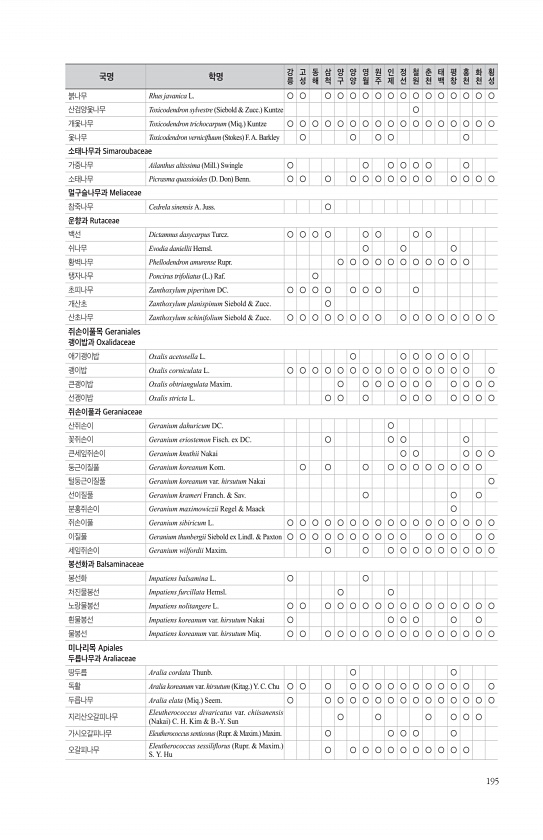 195 붉나무 Rhus javanica L. ○ ○ ○ ○ ○ ○ ○ ○ ○ ○ ○ ○ ○ ○ ○ ○ 산검양옻나무 Toxicodendron sylvestre Siebold & Zucc. Kuntze ○ 개옻나무 Toxicodendron trichocarpum Miq. Kuntze ○ ○ ○ ○ ○ ○ ○ ○ ○ ○ ○ ○ ○ ○ ○ ○ ○ 옻나무 Toxicodendron vernicifuum Stokes F. A. Barkley ○ ○ ○ ○ ○ 소태나무과 Simaroubaceae 가중나무 Ailanthus altissima Mill. Swingle ○ ○ ○ ○ ○ ○ ○ 소태나무 Picrasma quassioides D. Don Benn. ○ ○ ○ ○ ○ ○ ○ ○ ○ ○ ○ ○ ○ ○ 멀구슬나무과 M...