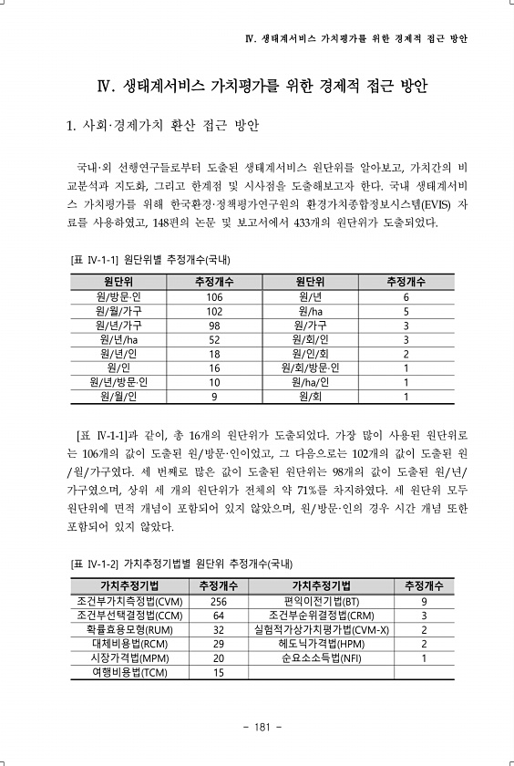 Ⅳ. 생태계서비스 가치평가를 위한 경제적 접근 방안 181 Ⅳ. 생태계서비스 가치평가를 위한 경제적 접근 방안 1. 사회·경제가치 환산 접근 방안 국내·외 선행연구들로부터 도출된 생태계서비스 원단위를 알아보고, 가치간의 비 교분석과 지도화, 그리고 한계점 및 시사점을 도출해보고자 한다. 국내 생태계서비 스 가치평가를 위해 한국환경·정책평가연구원의 환경가치종합정보시스템 EVIS 자 료를 사용하였고, 148편의 논문 및 보고서에서 433개의 원단위가 도출되었다. 원단위 추정개수 원단위 추정개수 원/방문·인 106 원/년 6 원/월/가구 102 원/ha 5 원/년/가구 98 원/가구 3 원/년/ha 52 원/회/인 3 원/년/인 18 원/인/회 2 원/인 16 원/회/방문·인 1 원/년/방문·인 10 원/ha/인...