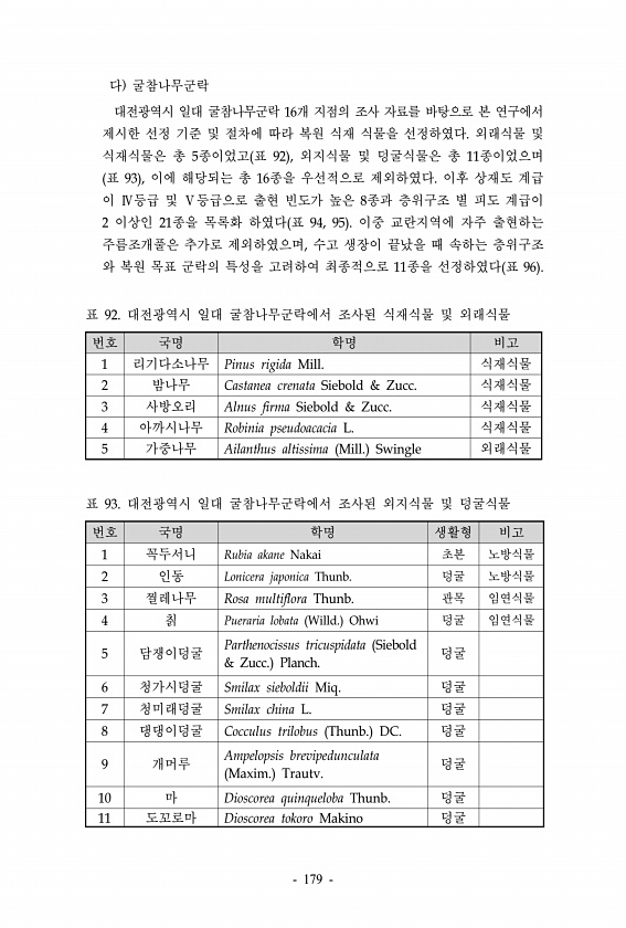 다 굴참나무군락 대전광역시 일대 굴참나무군락 16개 지점의 조사 자료를 바탕으로 본 연구에서 제시한 선정 기준 및 절차에 따라 복원 식재 식물을 선정하였다. 외래식물 및 식재식물은 총 5종이었고 표 92 , 외지식물 및 덩굴식물은 총 11종이었으며 표 93 , 이에 해당되는 총 16종을 우선적으로 제외하였다. 이후 상재도 계급 이 Ⅳ등급 및 Ⅴ등급으로 출현 빈도가 높은 8종과 층위구조 별 피도 계급이 2 이상인 21종을 목록화 하였다 표 94, 95 이중 교란지역에 자주 출현하는 주름조개풀은 추가로 제외하였으며, 수고 생장이 끝났을 때 속하는 층위구조 와 복원 목표 군락의 특성을 고려하여 최종적으로 11종을 선정하였다 표 96 번호 국명 학명 비고 1 리기다소나무 Pinus rigida Mill. 식재식물 ...
