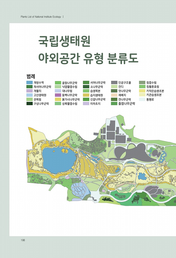 198 Plants List of National Institute Ecology Ⅰ 국립생태원 야외공간 유형 분류도 범례 개서어나무군락 구상나무군락 굴참나무군락 동백나무군락 붉가시나무군락 상록활엽수림 서어나무군락 소나무군락 신갈나무군락 잣나무군락 전나무군락 졸참나무군락 개방수역 침활혼효림 침엽수림 재배지 잔디 인공구조물 이차초지 습지생태원 대나무림 습생목본 낙엽활엽수림 키큰습생초본 키작은습생초본 관목림 통행로 고산생태원개활지