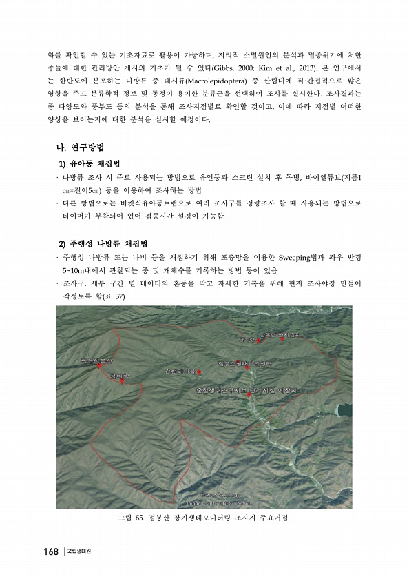 화를 확인할 수 있는 기초자료로 활용이 가능하며 지리적 소멸원인의 분석과 멸종위기에 처한 종들에 대한 관리방안 제시의 기초가 될 수 있다 본 연구에서 는 한반도에 분포하는 나방류 중 대시류 중 산림내에 직 간접적으로 많은 영향을 주고 분류학적 정보 및 동정이 용이한 분류군을 선택하여 조사를 실시한다 조사결과는 종 다양도와 풍부도 등의 분석을 통해 조사지점별로 확인할 것이고 이에 따라 지점별 어떠한 양상을 보이는지에 대한 분석을 실시할 예정이다 나 연구방법 유아등 채집법 나방류 조사 시 주로 사용되는 방법으로 유인등과 스크린 설치 후 독병 바이엘튜브 지름 길이 등을 이용하여 조사하는 방법 다른 방법으로는 버킷식유아등트랩으로 여러 조사구를 정량조사 할 때 사용되는 방법으로 타이머가 부착되어 있어 점등시간 설정이...