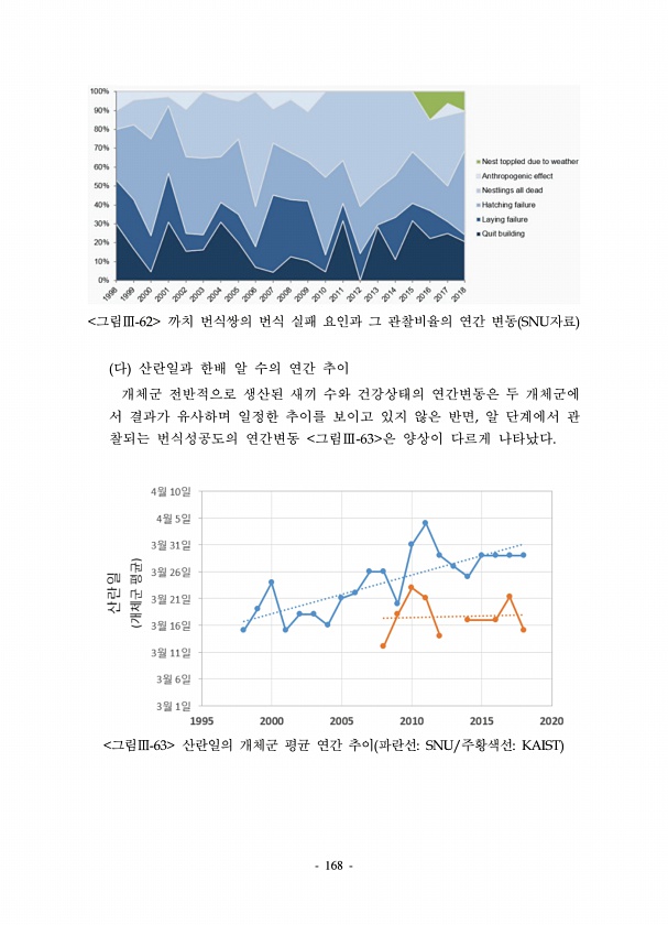 168 그림Ⅲ-62 까치 번식쌍의 번식 실패 요인과 그 관찰비율의 연간 변동 SNU자료 다 산란일과 한배 알 수의 연간 추이 개체군 전반적으로 생산된 새끼 수와 건강상태의 연간변동은 두 개체군에 서 결과가 유사하며 일정한 추이를 보이고 있지 않은 반면, 알 단계에서 관 찰되는 번식성공도의 연간변동 그림Ⅲ-63 은 양상이 다르게 나타났다. 그림Ⅲ-63 산란일의 개체군 평균 연간 추이 파란선SNU/주황색선KAIST