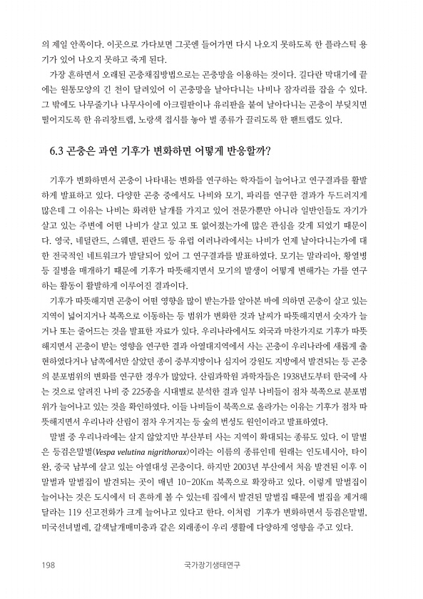 198 국가장기생태연구 의 제일 안쪽이다. 이곳으로 가다보면 그곳엔 들어가면 다시 나오지 못하도록 한 플라스틱 용 기가 있어 나오지 못하고 죽게 된다. 가장 흔하면서 오래된 곤충채집방법으로는 곤충망을 이용하는 것이다. 길다란 막대기에 끝 에는 원통모양의 긴 천이 달려있어 이 곤충망을 날아다니는 나비나 잠자리를 잡을 수 있다. 그 밖에도 나무줄기나 나무사이에 아크릴판이나 유리판을 붙여 날아다니는 곤충이 부딪치면 떨어지도록 한 유리창트랩, 노랑색 접시를 놓아 벌 종류가 끌리도록 한 팬트랩도 있다. 6.3 곤충은 과연 기후가 변화하면 어떻게 반응할까? 기후가 변화하면서 곤충이 나타내는 변화를 연구하는 학자들이 늘어나고 연구결과를 활발 하게 발표하고 있다. 다양한 곤충 중에서도 나비와 모기, 파리를 연구한 결과가 ...