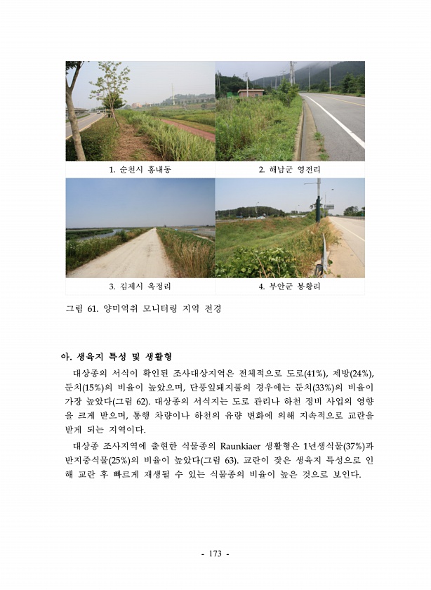 173 1. 순천시 홍내동 2. 해남군 영전리 3. 김제시 옥정리 4. 부안군 봉황리 그림 61. 양미역취 모니터링 지역 전경 아. 생육지 특성 및 생활형 대상종의 서식이 확인된 조사대상지역은 전체적으로 도로 41% , 제방 24% , 둔치 15% 의 비율이 높았으며, 단풍잎돼지풀의 경우에는 둔치 33% 의 비율이 가장 높았다 그림 62 대상종의 서식지는 도로 관리나 하천 정비 사업의 영향 을 크게 받으며, 통행 차량이나 하천의 유량 변화에 의해 지속적으로 교란을 받게 되는 지역이다. 대상종 조사지역에 출현한 식물종의 Raunkiaer 생활형은 1년생식물 37% 과 반지중식물 25% 의 비율이 높았다 그림 63 교란이 잦은 생육지 특성으로 인 해 교란 후 빠르게 재생될 수 있는 식물종의 비율이 높은 것으로보...