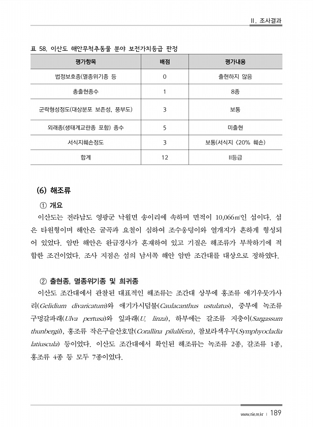 Ⅱ. 조사결과 www.nie.re.kr ? 189 표 58. 이산도 해안무척추동물 분야 보전가치등급 판정 평가항목 배점 평가내용 법정보호종 멸종위기종 등 0 출현하지 않음 총출현종수 1 8종 군락형성정도 대상분포 보존성, 풍부도 3 보통 외래종 생태계교란종 포함 종수 5 미출현 서식지훼손정도 3 보통 서식지 20% 훼손 합계 12 II등급 6 해조류 ① 개요 이산도는 전라남도 영광군 낙월면 송이리에 속하며 면적이 10,066㎡인 섬이다. 섬 은 타원형이며 해안은 굴곡과 요철이 심하여 조수웅덩이와 열개지가 흔하게 형성되 어 있었다. 암반 해안은 완급경사가 혼재하여 있고 기질은 해조류가 부착하기에 적 합한 조건이었다. 조사 지점은 섬의 남서쪽 해안 암반 조간대를 대상으로 정하였다. ② 출현종, 멸종위기종 및 희...