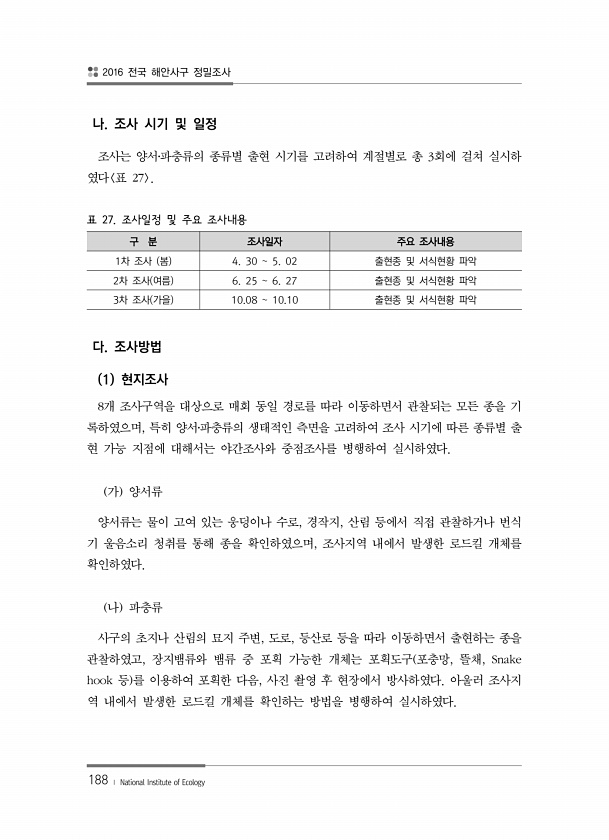 2016 전국 해안사구 정밀조사 188 ? National Institute of Ecology 나. 조사 시기 및 일정 조사는 양서?파충류의 종류별 출현 시기를 고려하여 계절별로 총 3회에 걸쳐 실시하 였다 표 27 표 27. 조사일정 및 주요 조사내용 구 분 조사일자 주요 조사내용 1차 조사 봄 4. 30 5. 02 출현종 및 서식현황 파악 2차 조사 여름 6. 25 6. 27 출현종 및 서식현황 파악 3차 조사 가을 10.08 10.10 출현종 및 서식현황 파악 다. 조사방법 1 현지조사 8개 조사구역을 대상으로 매회 동일 경로를 따라 이동하면서 관찰되는 모든 종을 기 록하였으며, 특히 양서?파충류의 생태적인 측면을 고려하여 조사 시기에 따른 종류별 출 현 가능 지점에 대해서는 야간조사와 중점조사를 병...