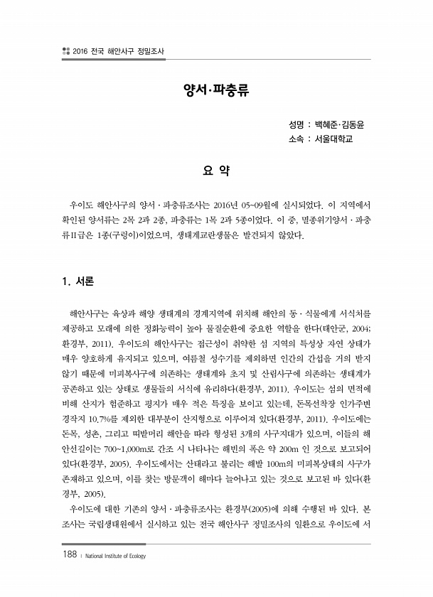 2016 전국 해안사구 정밀조사 188 ? National Institute of Ecology 양서·파충류 성명 백혜준·김동윤 소속 서울대학교 요 약 우이도 해안사구의 양서·파충류조사는 2016년 0509월에 실시되었다. 이 지역에서 확인된 양서류는 2목 2과 2종, 파충류는 1목 2과 5종이었다. 이 중, 멸종위기양서·파충 류Ⅱ급은 1종 구렁이 이었으며, 생태계교란생물은 발견되지 않았다. 1. 서론 해안사구는 육상과 해양 생태계의 경계지역에 위치해 해안의 동·식물에게 서식처를 제공하고 모래에 의한 정화능력이 높아 물질순환에 중요한 역할을 한다 태안군, 2004; 환경부, 2011 우이도의 해안사구는 접근성이 취약한 섬 지역의 특성상 자연 상태가 매우 양호하게 유지되고 있으며, 여름철 성수기를 제외하면 인...