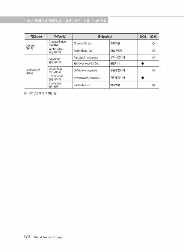 2015 특정도서 정밀조사 서산·태안·고흥·보성 권역 190 ? National Institute of Ecology 목 Order 과 Family 종 Species 2008 2015 Diptera 파리목 Drosophilidae 초파리과 Drosophila sp. 초파리류 ◎ Tephritidae 과실파리과 Tephritidae sp. 과실파리류 ◎ Lepidoptera 나비목 Satyridae 뱀눈나비과 Mycalesis francisca 부처사촌나비 ◎ Ypthima multistriata 물결나비 ● Lycaenidae 부전나비과 Celastrina argiolus 푸른부전나비 ◎ Hesperiidae 팔랑나비과 Aeromachus inachus 파리팔랑나비 ● Noctuidae 밤나방과 Noctui...