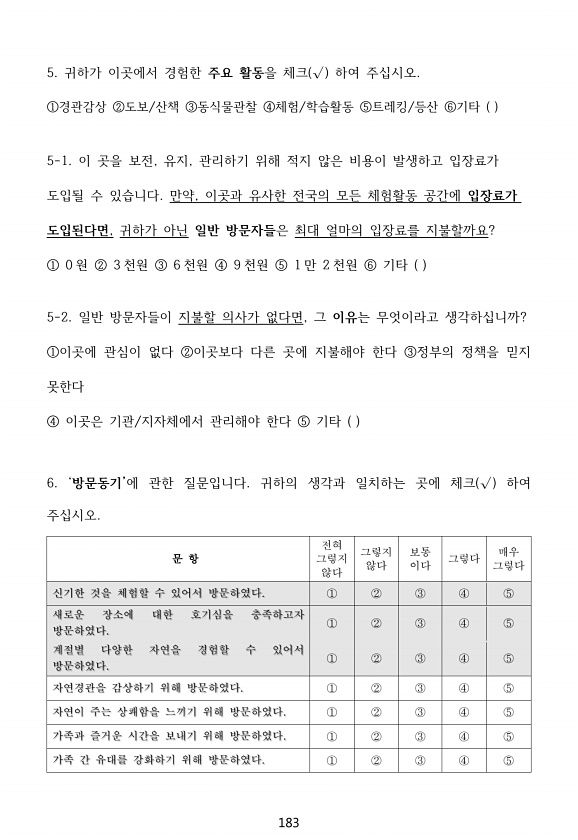 183 5. 귀하가 이곳에서 경험한 주요 활동을 체크 √ 하여 주십시오. ①경관감상 ②도보/산책 ③동식물관찰 ④체험/학습활동 ⑤트레킹/등산 ⑥기타 5-1. 이 곳을 보전, 유지, 관리하기 위해 적지 않은 비용이 발생하고 입장료가 도입될 수 있습니다. 만약, 이곳과 유사한 전국의 모든 체험활동 공간에 입장료가 도입된다면, 귀하가 아닌 일반 방문자들은 최대 얼마의 입장료를 지불할까요? ① 0 원 ② 3 천원 ③ 6 천원 ④ 9 천원 ⑤ 1 만 2 천원 ⑥ 기타 5-2. 일반 방문자들이 지불할 의사가 없다면, 그 이유는 무엇이라고 생각하십니까? ①이곳에 관심이 없다 ②이곳보다 다른 곳에 지불해야 한다 ③정부의 정책을 믿지 못한다 ④ 이곳은 기관/지자체에서 관리해야 한다 ⑤ 기타 6. ‘방문동기’에 관한 질문입니다...
