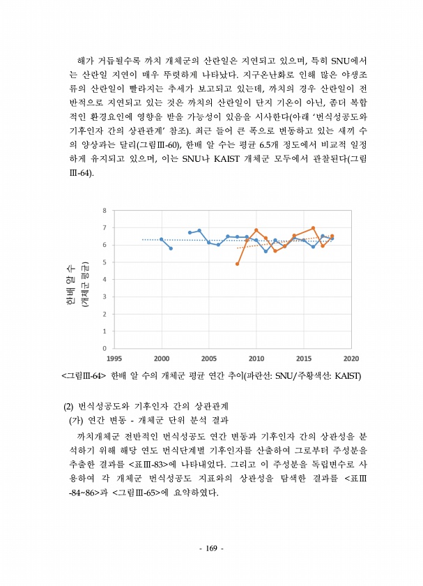 169 해가 거듭될수록 까치 개체군의 산란일은 지연되고 있으며, 특히 SNU에서 는 산란일 지연이 매우 뚜렷하게 나타났다. 지구온난화로 인해 많은 야생조 류의 산란일이 빨라지는 추세가 보고되고 있는데, 까치의 경우 산란일이 전 반적으로 지연되고 있는 것은 까치의 산란일이 단지 기온이 아닌, 좀더 복합 적인 환경요인에 영향을 받을 가능성이 있음을 시사한다 아래 ‘번식성공도와 기후인자 간의 상관관계’ 참조 최근 들어 큰 폭으로 변동하고 있는 새끼 수 의 양상과는 달리 그림Ⅲ-60 , 한배 알 수는 평균 6.5개 정도에서 비교적 일정 하게 유지되고 있으며, 이는 SNU나 KAIST 개체군 모두에서 관찰된다 그림 Ⅲ-64 그림Ⅲ-64 한배 알 수의 개체군 평균 연간 추이 파란선SNU/주황색선KAIST 2 번식성공도...