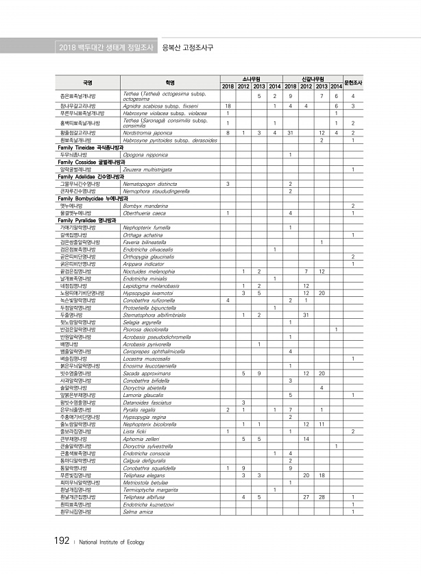 2018 백두대간 생태계 정밀조사 응복산 고정조사구 192 ? National Institute of Ecology 국명 학명 소나무림 신갈나무림 문헌조사 2018 2012 2013 2014 2018 2012 2013 2014 좁은뾰족날개나방 Tethea Tethea octogesima subsp. octogesima 5 2 9 7 6 4 참나무갈고리나방 Agnidra scabiosa subsp. fixseni 18 1 4 4 6 3 푸른무늬뾰족날개나방 Habrosyne violacea subsp. violacea 1 1 홍백띠뾰족날개나방 Tethea Saronaga consimilis subsp. consimilis 1 1 1 2 황줄점갈고리나방 Nordstromia japonica 8 1 3 4 31 1...