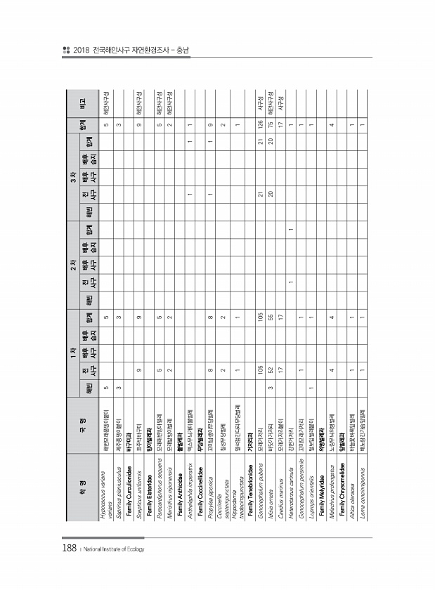 188 학 명 국 명 1 차 2 차 3 차 합계 비고 해빈 전 사구 배후 사구 배후 습지 합계 해빈 사구 전 배후 사구 배후 습지 합계 해빈 사구 전 배후 사구 배후 습지 합계 Hypocaccus varians varians 해변모래풍뎅이붙이 5 5 5 해안사구성 Saprinus planiusculus 제주풍뎅이붙이 3 3 3 Family Curculionidae 바구미과 Scepticus uniformis 표주박바구미 9 9 9 해안사구성 Family Elateridae 방아벌레과 Paracardiphorus sequens 모래해변방아벌레 5 5 5 해안사구성 Meristhus niponensis 모래밭방아벌레 2 2 2 해안사구성 Family Anthicidae 뿔벌레과 Anthelephila imper...