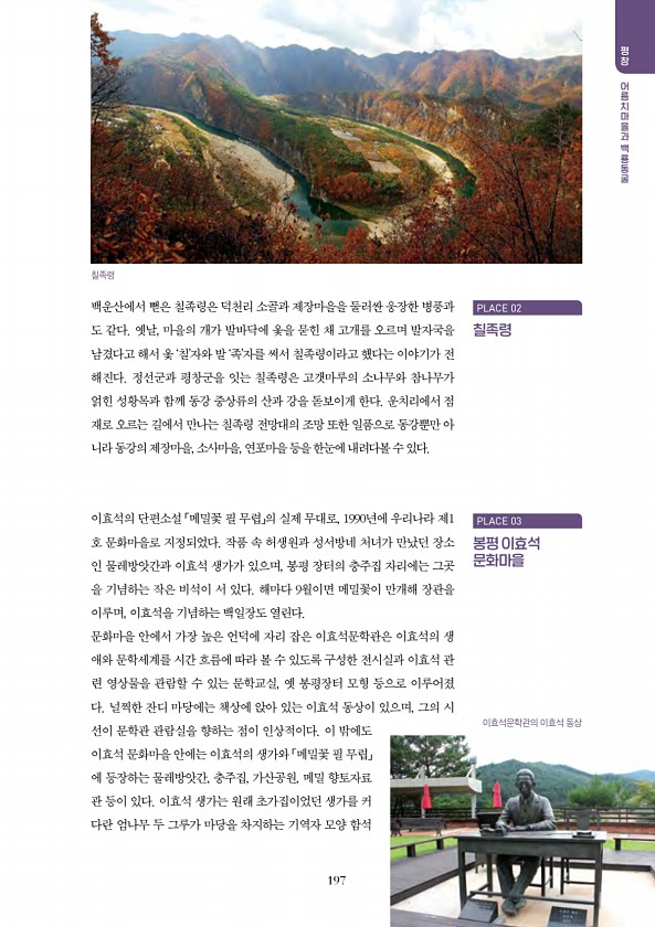 197 평창 어 어 어 어 어 어 어어 어 어 어 백운산에서 뻗은 칠족령은 덕천리 소골과 제장마을을 둘러싼 웅장한 병풍과 도 같다. 옛날, 마을의 개가 발바닥에 옻을 묻힌 채 고개를 오르며 발자국을 남겼다고 해서 옻 ‘칠’자와 발 ‘족’자를 써서 칠족령이라고 했다는 이야기가 전 해진다. 정선군과 평창군을 잇는 칠족령은 고갯마루의 소나무와 참나무가 얽힌 성황목과 함께 동강 중상류의 산과 강을 돋보이게 한다. 운치리에서 점 재로 오르는 길에서 만나는 칠족령 전망대의 조망 또한 일품으로 동강뿐만 아 니라 동강의 제장마을, 소사마을, 연포마을 등을 한눈에 내려다볼 수 있다. 이효석의 단편소설 「메밀꽃 필 무렵」의 실제 무대로, 1990년에 우리나라 제1 호 문화마을로 지정되었다. 작품 속 허생원과 성서방네 처녀가 ...