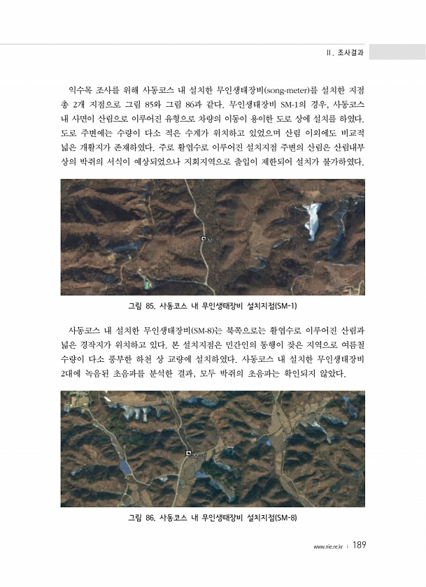 Ⅱ. 조사결과 www.nie.re.kr ? 189 익수목 조사를 위해 사동코스 내 설치한 무인생태장비 song-meter 를 설치한 지점 총 2개 지점으로 그림 85와 그림 86과 같다. 무인생태장비 SM-1의 경우, 사동코스 내 사면이 산림으로 이루어진 유형으로 차량의 이동이 용이한 도로 상에 설치를 하였다. 도로 주변에는 수량이 다소 적은 수계가 위치하고 있었으며 산림 이외에도 비교적 넓은 개활지가 존재하였다. 주로 활엽수로 이루어진 설치지점 주변의 산림은 산림내부 상의 박쥐의 서식이 예상되었으나 지회지역으로 출입이 제한되어 설치가 불가하였다. 그림 85. 사동코스 내 무인생태장비 설치지점 SM-1 사동코스 내 설치한 무인생태장비 SM-8 는 북쪽으로는 활엽수로 이루어진 산림과 넓은 경작지가 위치하고 있...