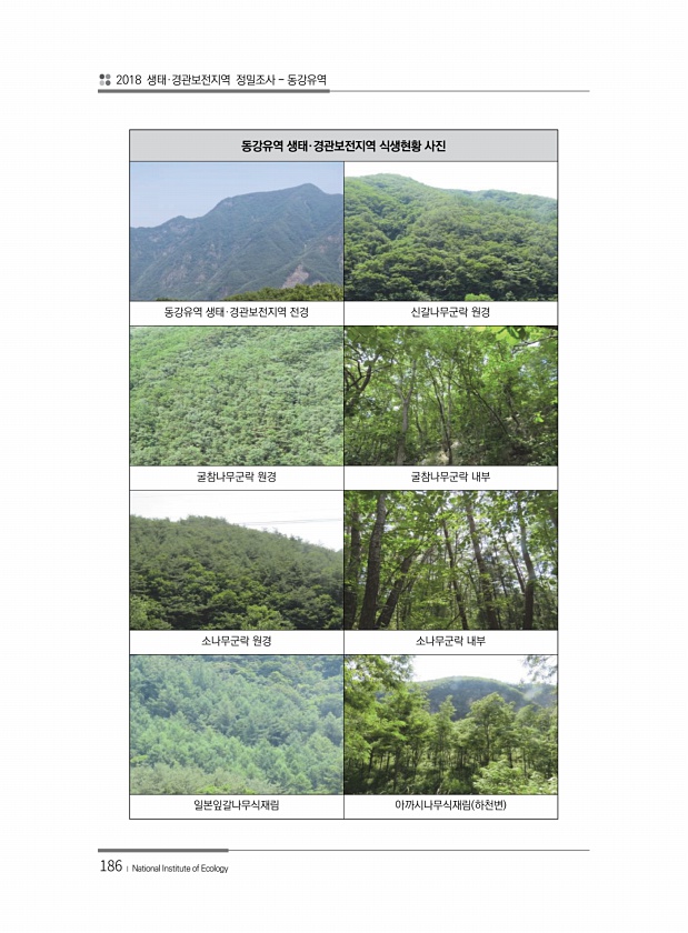 2018 생태·경관보전지역 정밀조사 동강유역 186 ? National Institute of Ecology 동강유역 생태·경관보전지역 식생현황 사진 동강유역 생태·경관보전지역 전경 신갈나무군락 원경 굴참나무군락 원경 굴참나무군락 내부 소나무군락 원경 소나무군락 내부 일본잎갈나무식재림 아까시나무식재림 하천변
