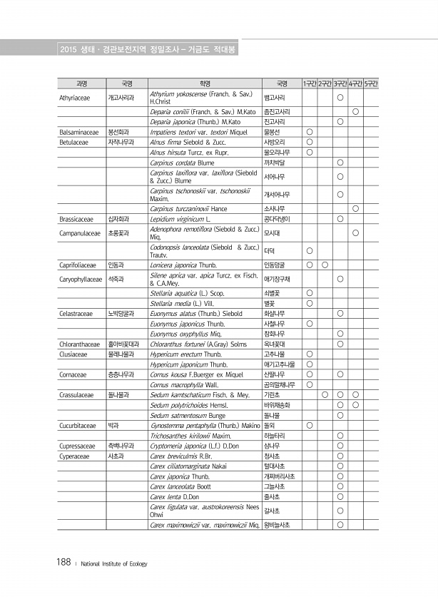 2015 생태·경관보전지역 정밀조사 거금도 적대봉 188 ? National Institute of Ecology 과명 국명 학명 국명 1구간 2구간 3구간 4구간 5구간 Athyriaceae 개고사리과 Athyrium yokoscense Franch. & Sav. H.Christ 뱀고사리 ? Deparia conilii Franch. & Sav. M.Kato 좀진고사리 ? Deparia japonica Thunb. M.Kato 진고사리 ? Balsaminaceae 봉선화과 Impatiens textori var. textori Miquel 물봉선 ? Betulaceae 자작나무과 Alnus firma Siebold & Zucc. 사방오리 ? Alnus hirsuta Turcz. ex Rupr. 물오리나무 ...