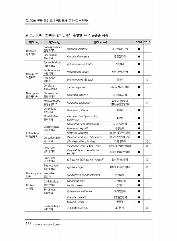 2016 전국 특정도서 정밀조사 옹진-북부권역 188 ? National Institute of Ecology 목 Order 과 Family 종 Species 2007 2016 Odonata 잠자리목 Coenagrionidae 실잠자리과 Ischnura asiatica 아시아실잠자리 ● Libellulidae 잠자리과 Pantala flavescens 된장잠자리 ● Hemiptera 노린재목 Aphrophoridae 거품벌레과 Aphrophora pectiralis 거품벌레 ● Pentatomidae 노린재과 Halyomorha halys 썩덩나무노린재 ● Cicadidae 매미과 Oncotympana fuscata 참매미 ◎ Coreidae 허리노린재과 Cletus trigonus 벼가시허리노린재 ● Ne...