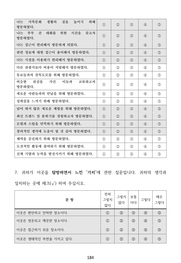 184 나는 가족문화 생활의 질을 높이기 위해 방문하였다. ① ② ③ ④ ⑤ 나는 부부 간 대화를 위한 시간을 갖고자 방문하였다. ① ② ③ ④ ⑤ 나는 접근이 편리해서 방문하게 되었다. ① ② ③ ④ ⑤ 관련 정보에 대한 접근이 용이해서 방문하였다. ① ② ③ ④ ⑤ 나는 시설을 이용하기 편리해서 방문하였다. ① ② ③ ④ ⑤ 다른 관광지보다 비용이 저렴해서 방문하였다. ① ② ③ ④ ⑤ 동료들과의 친목도모를 위해 방문하였다. ① ② ③ ④ ⑤ 비슷한 관심을 가진 이들과 교류하고자 방문하였다. ① ② ③ ④ ⑤ 새로운 사람들과의 만남을 위해 방문하였다. ① ② ③ ④ ⑤ 성취감을 느끼기 위해 방문하였다. ① ② ③ ④ ⑤ 남이 하지 않은 새로운 체험을 위해 방문하였다. ① ② ③ ④ ⑤ 최신 트렌드 및 분...