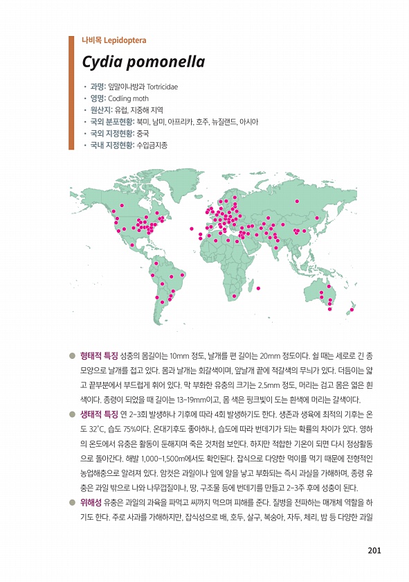 201 ● 형태적 특징 성충의 몸길이는 10mm 정도, 날개를 편 길이는 20mm 정도이다. 쉴 때는 세로로 긴 종 모양으로 날개를 접고 있다. 몸과 날개는 회갈색이며, 앞날개 끝에 적갈색의 무늬가 있다. 더듬이는 얇 고 끝부분에서 부드럽게 휘어 있다. 막 부화한 유충의 크기는 2.5mm 정도, 머리는 검고 몸은 엷은 흰 색이다. 종령이 되었을 때 길이는 13-19mm이고, 몸 색은 핑크빛이 도는 흰색에 머리는 갈색이다. ● 생태적 특징 연 2-3회 발생하나 기후에 따라 4회 발생하기도 한다. 생존과 생육에 최적의 기후는 온 도 32°C, 습도 75%이다. 온대기후도 좋아하나, 습도에 따라 번데기가 되는 확률의 차이가 있다. 영하 의 온도에서 유충은 활동이 둔해지며 죽은 것처럼 보인다. 하지만 적합한 기온이...