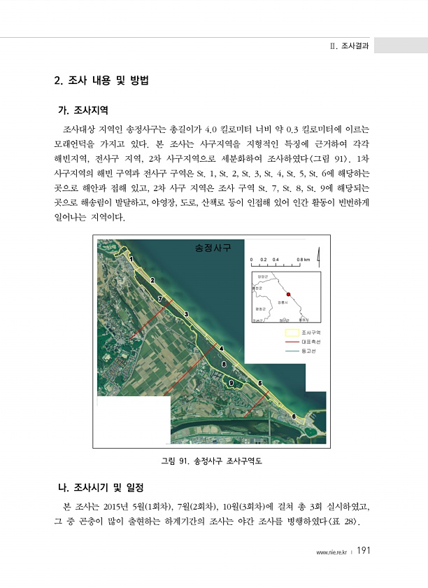 Ⅱ. 조사결과 www.nie.re.kr ? 191 2. 조사 내용 및 방법 가. 조사지역 조사대상 지역인 송정사구는 총길이가 4.0 킬로미터 너비 약 0.3 킬로미터에 이르는 모래언덕을 가지고 있다. 본 조사는 사구지역을 지형적인 특징에 근거하여 각각 해빈지역, 전사구 지역, 2차 사구지역으로 세분화하여 조사하였다 그림 91 1차 사구지역의 해빈 구역과 전사구 구역은 St. 1, St. 2, St. 3, St. 4, St. 5, St. 6에 해당하는 곳으로 해안과 접해 있고, 2차 사구 지역은 조사 구역 St. 7, St. 8, St. 9에 해당되는 곳으로 해송림이 발달하고, 야영장, 도로, 산책로 등이 인접해 있어 인간 활동이 빈번하게 일어나는 지역이다. 그림 91. 송정사구 조사구역도 나. 조사시기 및 ...