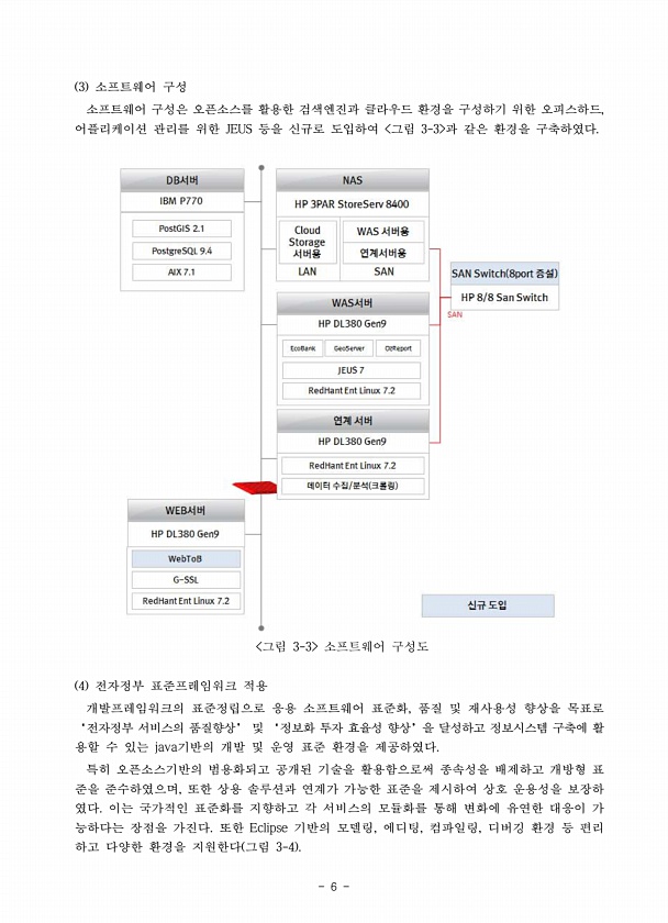6 3 소프트웨어 구성 소프트웨어 구성은 오픈소스를 활용한 검색엔진과 클라우드 환경을 구성하기 위한 오피스하드, 어플리케이션 관리를 위한 JEUS 등을 신규로 도입하여 그림 3-3 과 같은 환경을 구축하였다. 그림 3-3 소프트웨어 구성도 4 전자정부 표준프레임워크 적용 개발프레임워크의 표준정립으로 응용 소프트웨어 표준화, 품질 및 재사용성 향상을 목표로 ‘전자정부 서비스의 품질향상’ 및 ‘정보화 투자 효율성 향상’을 달성하고 정보시스템 구축에 활 용할 수 있는 java기반의 개발 및 운영 표준 환경을 제공하였다. 특히 오픈소스기반의 범용화되고 공개된 기술을 활용함으로써 종속성을 배제하고 개방형 표 준을 준수하였으며, 또한 상용 솔루션과 연계가 가능한 표준을 제시하여 상호 운용성을 보장하 였다. 이는 국가적...