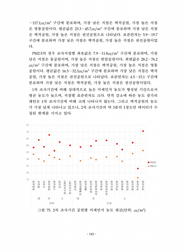 183 구간에 분포하며 가장 낮은 지점은 벽적공원 가장 높은 지점 은 영통공원이다 평균값은 구간에 분포하며 가장 낮은 지점 은 벽적공원 가장 높은 지점은 권선공원으로 나타났다 표준편차는 구간에 분포하며 가장 낮은 지점은 벽적공원 가장 높은 지점은 권선공원이었 다 의 경우 조사지점별 최솟값은 구간에 분포하며 가장 낮은 지점은 동공원이며 가장 높은 지점은 반달공원이다 최댓값은 구간에 분포하며 가장 낮은 지점은 벽적공원 가장 높은 지점은 영통 공원이다 평균값은 구간에 분포하며 가장 낮은 지점은 벽적 공원 가장 높은 지점은 권선공원으로 나타났다 표준편차는 구간에 분포하며 가장 낮은 지점은 벽적공원 가장 높은 지점은 권선공원이었다 차 조사기간에 비해 상대적으로 높은 미세먼지 농도가 형성된 기간으로서 평균 농도가 높으...