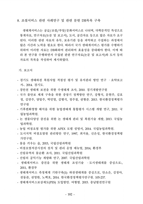 조절서비스 관련 사례연구 및 관련 문헌 목록 구축 생태계서비스는 공급 조절 부양 문화서비스로 나뉘며 다학문적인 특성으로 통계자료 연구자료 논문 및 보고서 도서 공간자료 등으로 많은 자료가 요구 된다 이러한 관련 자료의 유무 보유기관 등을 파악하고 수집하는 과정에서 많은 시간과 노력을 필요로 한다 따라서 국가 생태계서비스 평가를 수행하기 위하여 이러한 자료는 화하여 관리하여 효율성을 증대해야 한다 이에 따 라 본 연구를 수행하면서 수집된 관련 연구자료 논문 및 보고서 와 도서 등의 자료의 목록을 작성하여 제시하였다 가 보고서 경기도 생태하천 복원사업 적절성 평가 및 유지관리 방안 연구 요약보고 서 경기도 경안천 생태계 보전을 위한 수생태계 조사 경기개발연구원 국가 물안보 체계 구축을 위한 중장기 정책방안 연구...