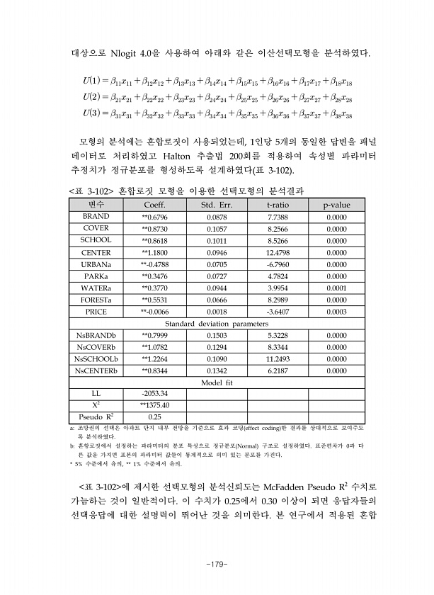 -179- 대상으로 을 사용하여 아래와 같은 이산선택모형을 분석하였다 ? ? ? ? ? ? ? ? ? ? ? ? ? ? ? ? ? ? ? ? ? ? ? ? 모형의 분석에는 혼합로짓이 사용되었는데 인당 개의 동일한 답변을 패널 데이터로 처리하였고 추출법 회를 적용하여 속성별 파라미터 추정치가 정규분포를 형성하도록 설계하였다 표 변수 조망권의 선택은 아파트 단지 내부 전망을 기준으로 효과 코딩 한 결과를 상대적으로 보여주...