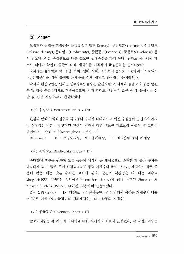 Ⅱ. 금일명사 사구 www.nie.re.kr ? 189 2 군집분석 모집단과 군집을 기술하는 측정값으로 밀도 Density , 우점도 Dominance , 상대밀도 Relative density , 종다양도 Biodiversity , 종균등도 Evenness , 종풍부도 Richness 등 이 있으며, 이들 측정값으로 다른 중요한 생태측정을 하게 된다. 관매도 사구에서 매 조사 때마다 확인된 종들에 대해 개체수를 기록하여 군집분석을 실시하였다. 양서류는 유형별로 알, 유생, 유체, 성체, 사체, 울음소리 등으로 구분하여 기록하였으 며, 군집분석을 위해 유형별 개체수를 성체 개체로 환산하여 분석하였다. 각각의 환산방법은 난괴는 난괴수×2, 유생은 발견지점×2, 사체와 울음소리 등은 발견 수 및 청음 수를 1개...