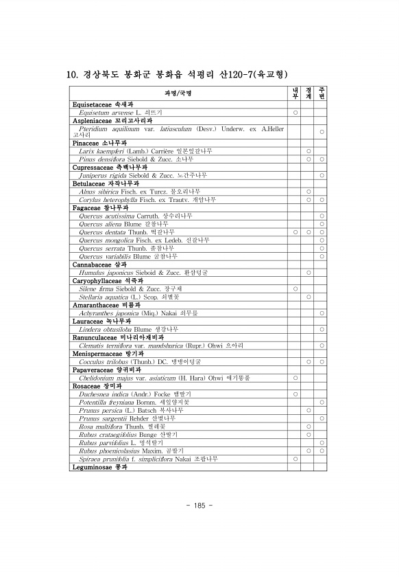 185 10. 경상북도 봉화군 봉화읍 석평리 산120-7 육교형 과명/국명 내 부 경 계 주 변 Equisetaceae 속새과 Equisetum arvense L. 쇠뜨기 ○ Aspleniaceae 꼬리고사리과 Pteridium aquilinum var. latiusculum Desv. Underw. ex A.Heller 고사리 ○ Pinaceae 소나무과 Larix kaempferi Lamb. Carri?re 일본잎갈나무 ○ Pinus densiflora Siebold & Zucc. 소나무 ○ ○ Cupressaceae 측백나무과 Juniperus rigida Siebold & Zucc. 노간주나무 ○ Betulaceae 자작나무과 Alnus sibirica Fisch. ex Turcz. 물오리나무 ○ C...