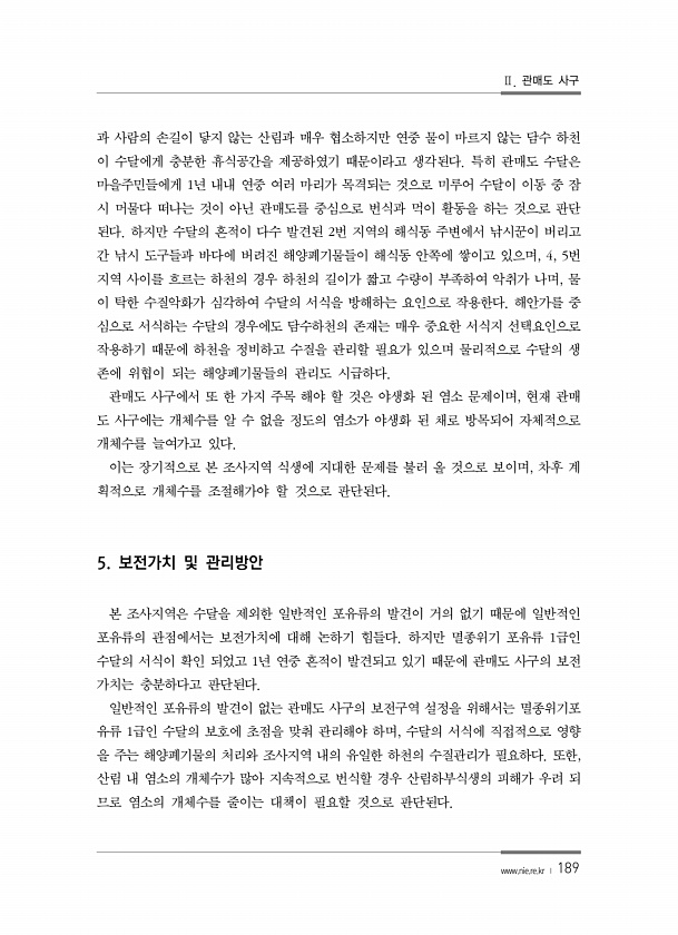 Ⅱ. 관매도 사구 www.nie.re.kr ? 189 과 사람의 손길이 닿지 않는 산림과 매우 협소하지만 연중 물이 마르지 않는 담수 하천 이 수달에게 충분한 휴식공간을 제공하였기 때문이라고 생각된다. 특히 관매도 수달은 마을주민들에게 1년 내내 연중 여러 마리가 목격되는 것으로 미루어 수달이 이동 중 잠 시 머물다 떠나는 것이 아닌 관매도를 중심으로 번식과 먹이 활동을 하는 것으로 판단 된다. 하지만 수달의 흔적이 다수 발견된 2번 지역의 해식동 주변에서 낚시꾼이 버리고 간 낚시 도구들과 바다에 버려진 해양폐기물들이 해식동 안쪽에 쌓이고 있으며, 4, 5번 지역 사이를 흐르는 하천의 경우 하천의 길이가 짧고 수량이 부족하여 악취가 나며, 물 이 탁한 수질악화가 심각하여 수달의 서식을 방해하는 요인으로 작용...