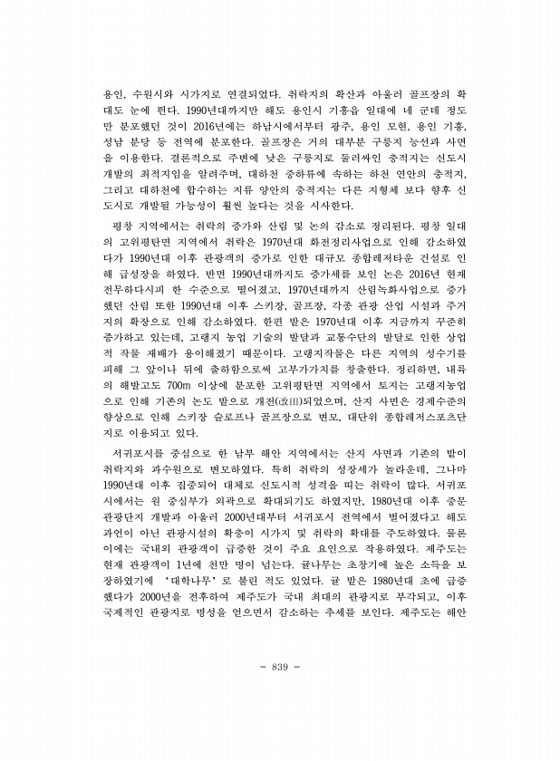 839 용인, 수원시와 시가지로 연결되었다. 취락지의 확산과 아울러 골프장의 확 대도 눈에 띈다. 1990년대까지만 해도 용인시 기흥읍 일대에 네 군데 정도 만 분포했던 것이 2016년에는 하남시에서부터 광주, 용인 모현, 용인 기흥, 성남 분당 등 전역에 분포한다. 골프장은 거의 대부분 구릉지 능선과 사면 을 이용한다. 결론적으로 주변에 낮은 구릉지로 둘러싸인 충적지는 신도시 개발의 최적지임을 알려주며, 대하천 중하류에 속하는 하천 연안의 충적지, 그리고 대하천에 합수하는 지류 양안의 충적지는 다른 지형체 보다 향후 신 도시로 개발될 가능성이 훨씬 높다는 것을 시사한다. 평창 지역에서는 취락의 증가와 산림 및 논의 감소로 정리된다. 평창 일대 의 고위평탄면 지역에서 취락은 1970년대 화전정리사업으로 인해...