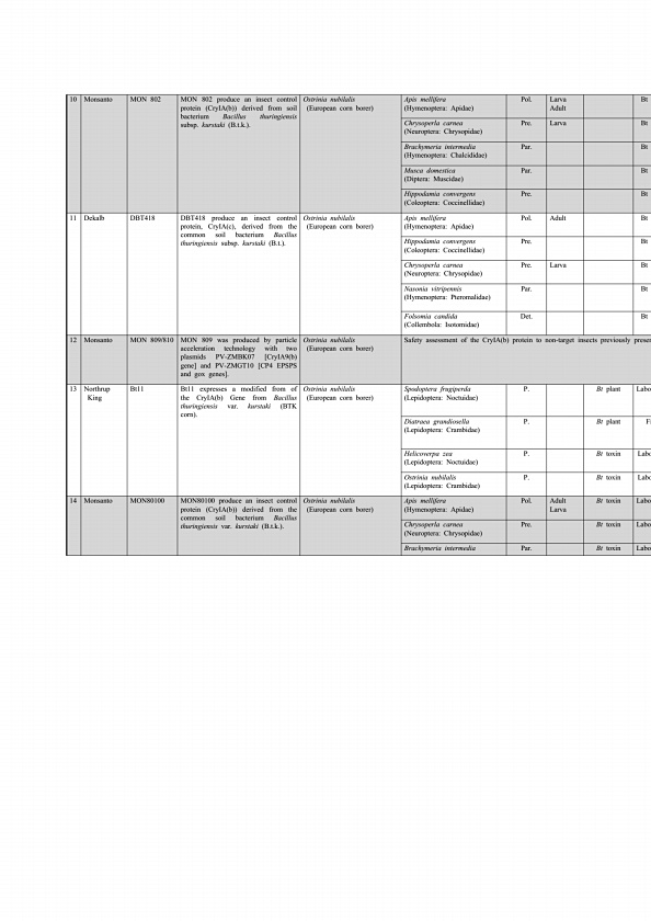 10 Monsanto MON 802 MON 802 produce an insect control protein CryIA b derived from soil bacterium Bacillus thuringiensis subsp. kurstaki B.t.k. Ostrinia nubilalis European corn borer Apis mellifera HymenopteraApidae Pol. Larva Adult Bt Chrysoperla carnea NeuropteraChrysopidae Pre. Larva Bt Brachymeria intermedia HymenopteraChalcididae Par. Bt Musca domestica DipteraMuscidae Par. Bt Hippodamia conv...